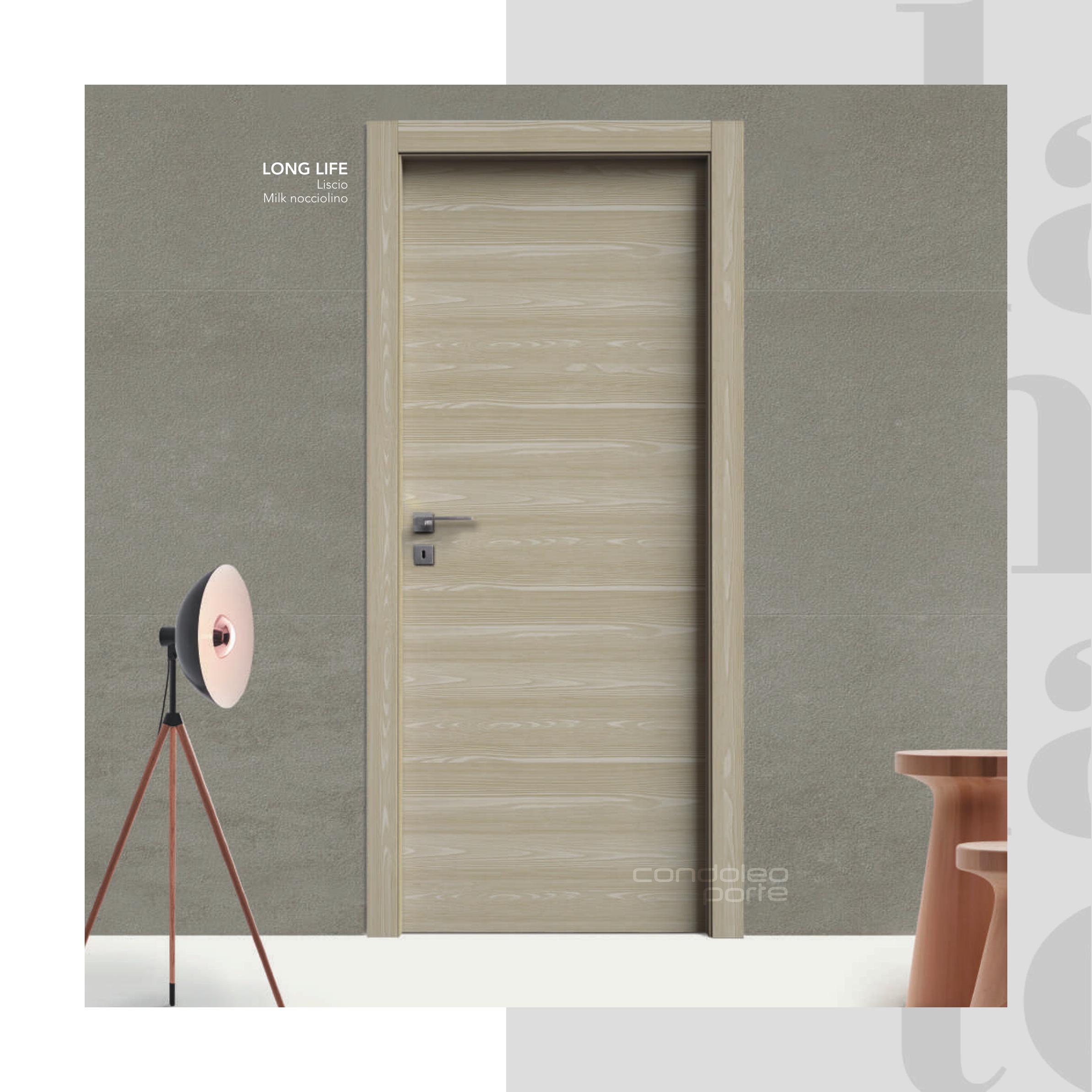 Ușă de interior Laminato Long Life by Condoleo Porte. Suprafață lisă, rezistentă la zgârieturi. Disponibilă în: Milk Nocciolino, Milk Bianco. Design minimalist perfect pentru orice interior. Made in Italy.