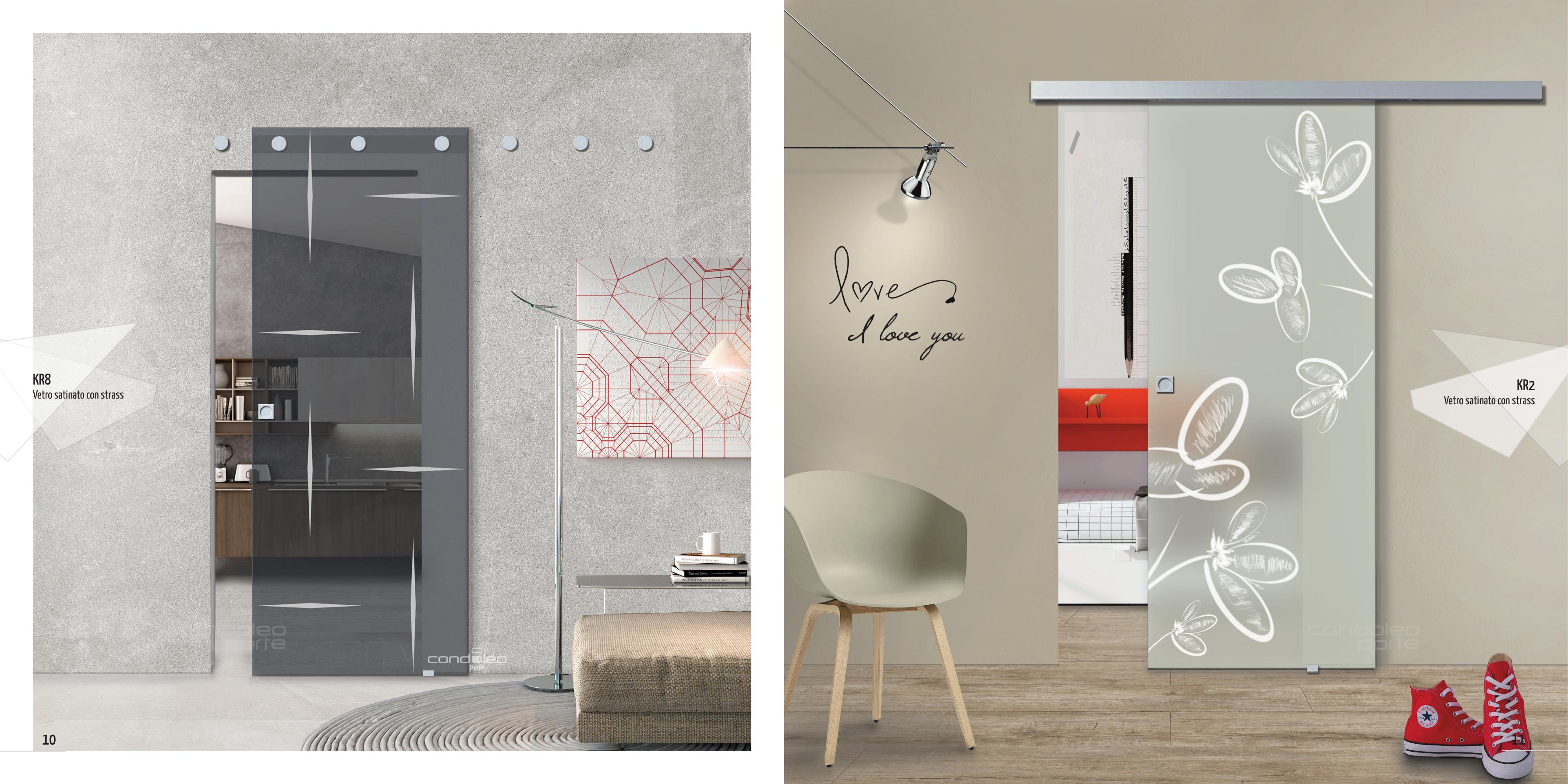 Ușă de interior din cristal by Condoleo Porte. Sticlă satinată cu decorație strass. Transparențe și reflexii care luminează orice interior. Made in Italy.
